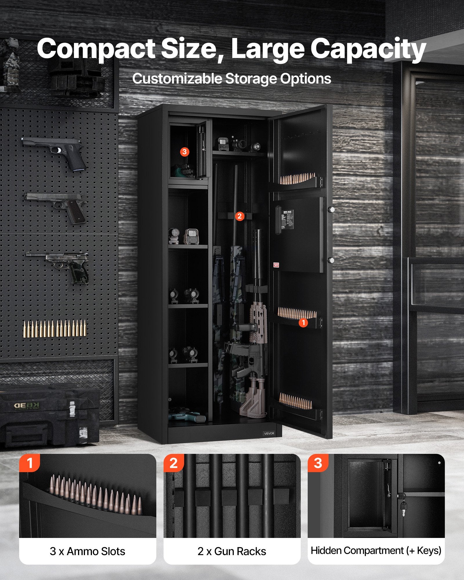 Large Capacity Safe: This gun safe can hold up to 4 rifles, with 3 ammo slots and 2 adjustable gun racks. It also features a hidden compartment (with a separate key) for storing firearm accessories, ammunition, or other valuable items