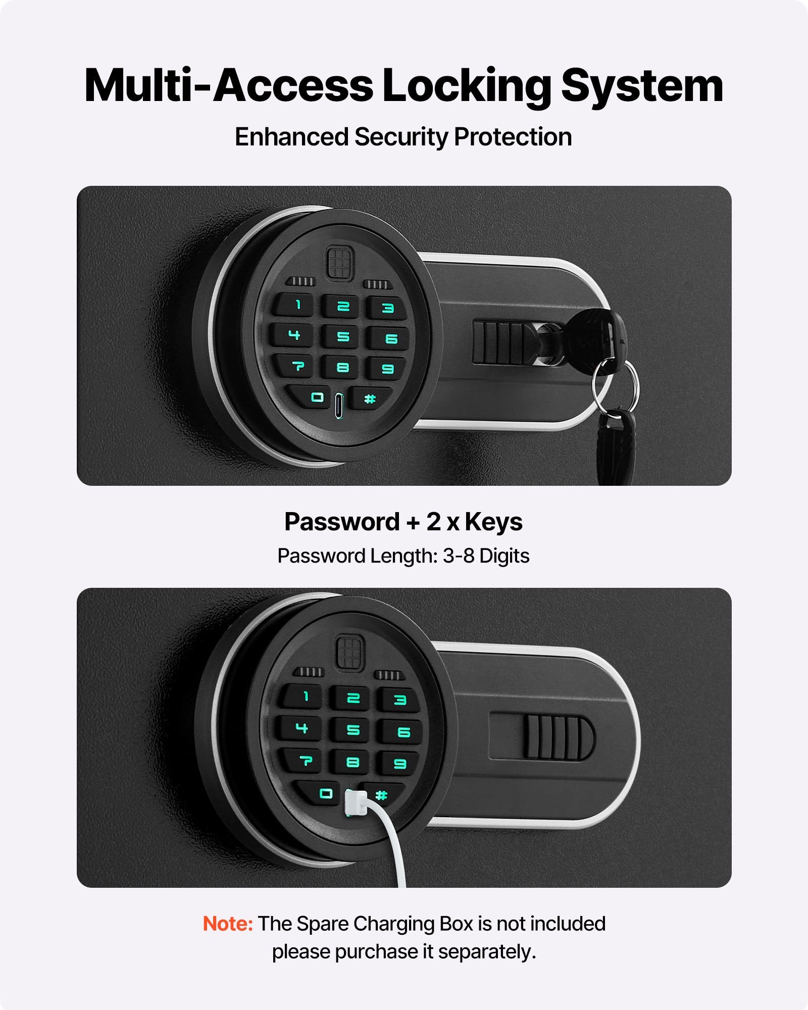 Smart Lock: The 9-digit touchscreen password lock provides quick access. The password can be set between 3-8 digits, with an auto-lock function for added security. It also includes an emergency key and spare charging box for easy unlocking during battery depletion. (Note: There is no battery inside, you need to buy 4 AA batteries separately.)