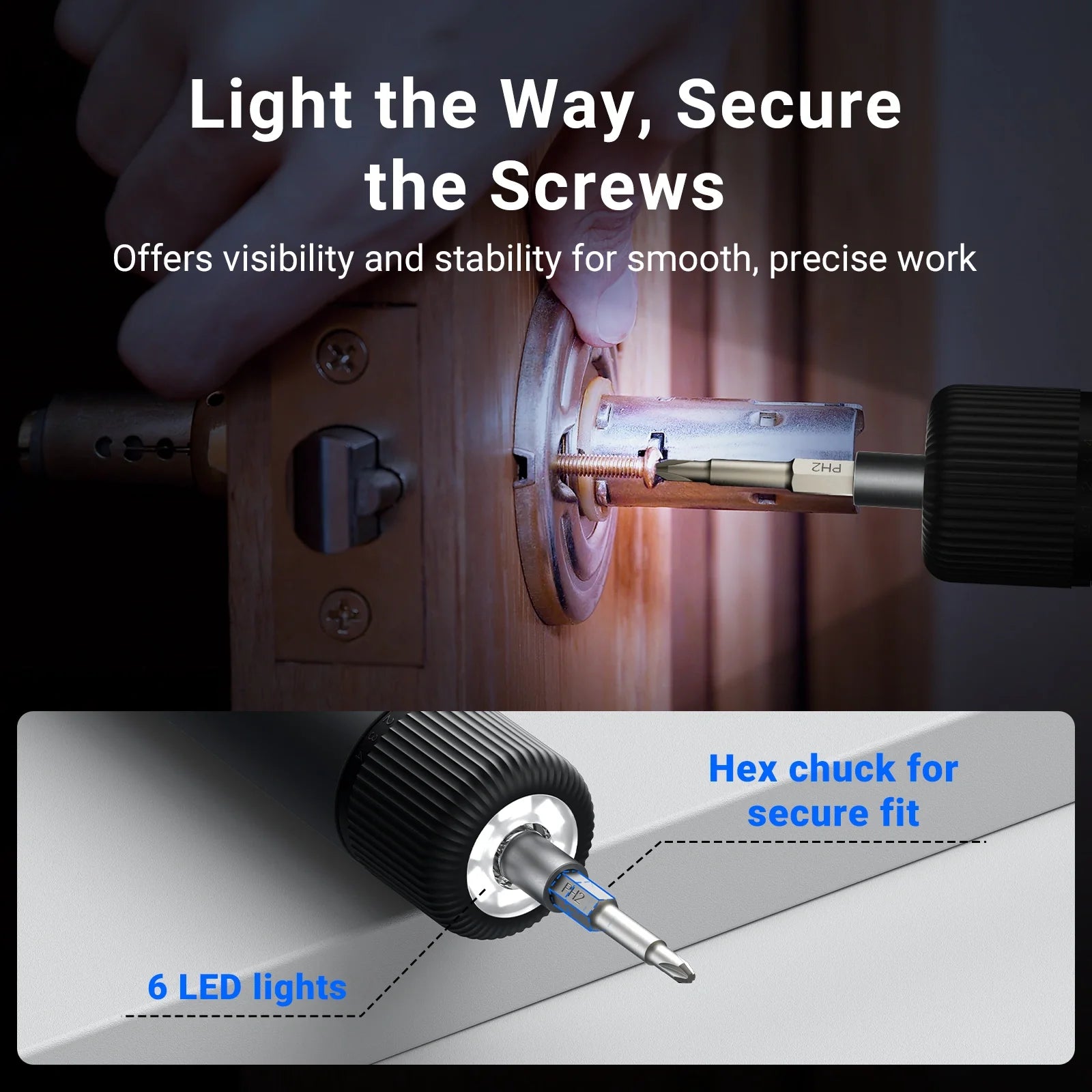 @Features Features Faster Assembly, Easier Control: This cordless screwdriver delivers up to 260 RPM and 8 N·m torque for efficient, powerful screwdriving, ideal for quick household tasks. 4 Adjustable Torque Control: This electric screwdriver offers 4 torque settings from 0.6 N·m to 8 N·m, with a twist handle for precise screwdriving and prevention of over-tightening. Long Battery Life with USB-C: This cordless screwdriver rechargeable drives over 1,000 screws per charge, recharges quickly via USB-C, and works while charging for uninterrupted tasks. Smart Control: Featuring intelligent torque control, the torque screwdriver automatically stops when the screw is fully tightened, with a forward/reverse button for precise, seamless operation. 28-in-1 Screwdriver Kit: This electronic screwdriver set includes an electric screwdriver, 24 S2 steel bits, an extension rod, and a USB-A to USB-C cable, all neatly stored in a compact storage box. Portable & Lightweight: Weighing just 1.87 lbs and measuring 7.28" x Ø 1.38", the compact design reduces fatigue during extended use. It comes neatly stored in a portable case for easy storage. Light the Way: With 6 LED lights for better visibility in dark areas and a hexagonal chuck (C6 6mm) securely holding bits, it ensures smooth, efficient work without losing small parts. Secure Handling: Designed with a tough ABS and TPE rubber grip, the power screwdriver offers comfort during long use and a smart chip prevents overload, overcharge, and overheating for safe, reliable performance. |